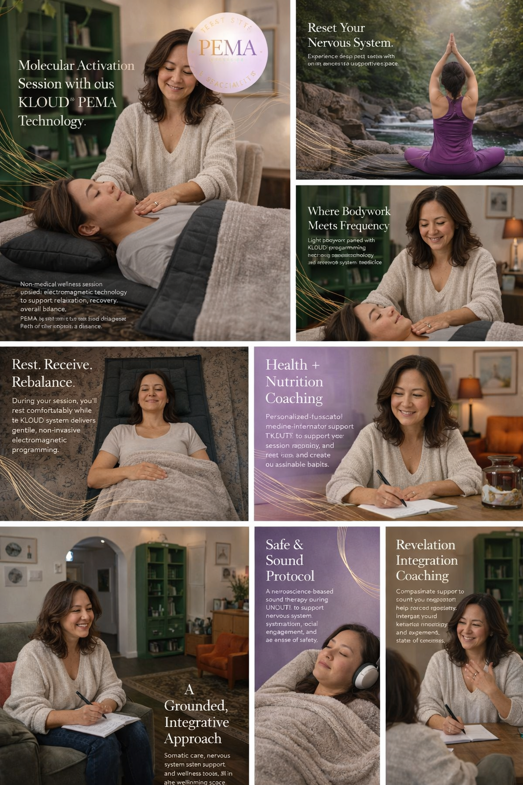 Non-medical wellness sessions in Berkeley using KLOUD® PEMA, integrative bodywork, and supportive coaching to help your body shift out of stress and into recovery.
